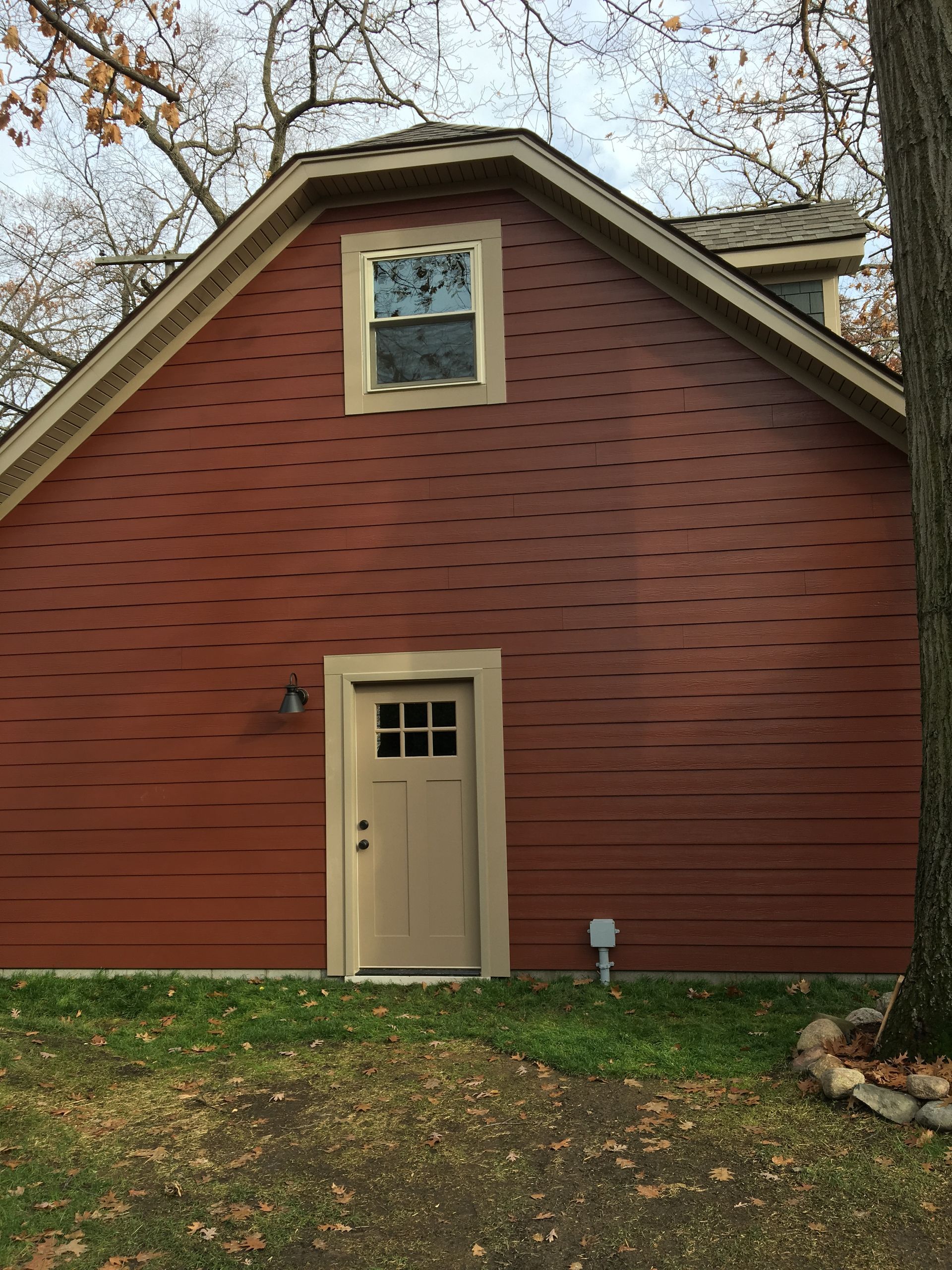 On the exterior we used Mastic Ventura vinyl soffit on all of the overhangs and aluminum trim on the rakes and eaves. The walls and gables and covered with James Hardie HardiePlank lap siding and HardieTrim boards. The dormers are covered with HardieShingle siding.
