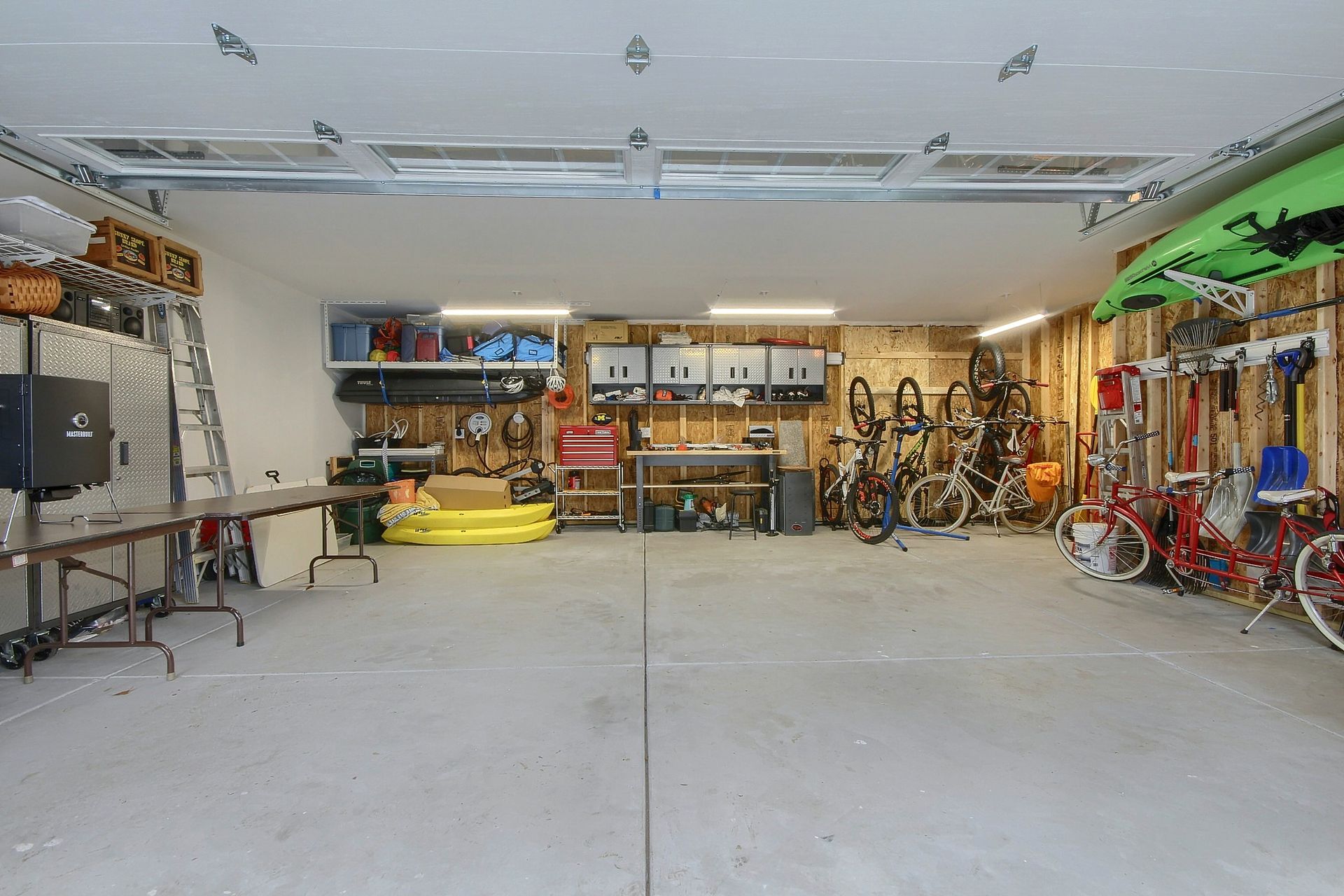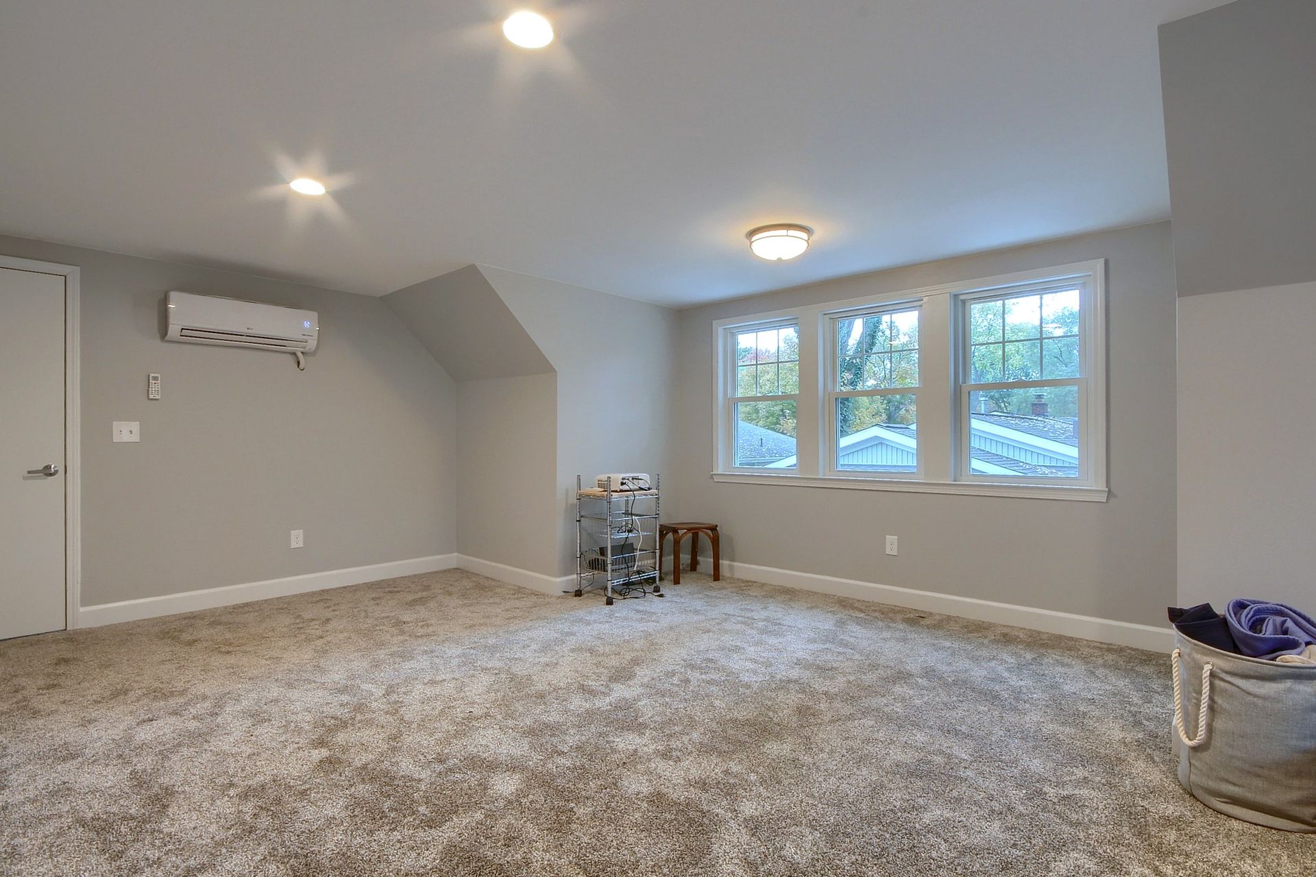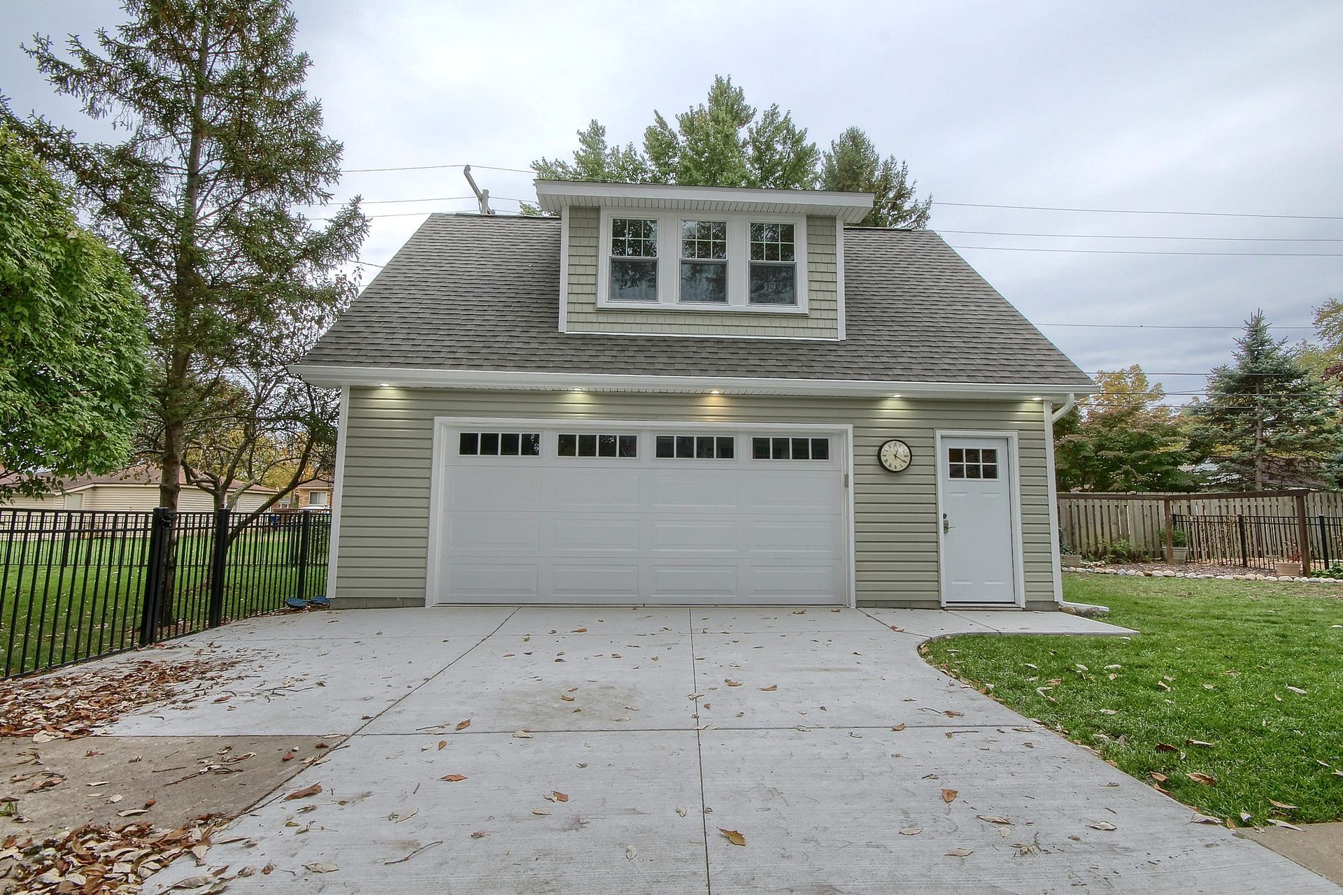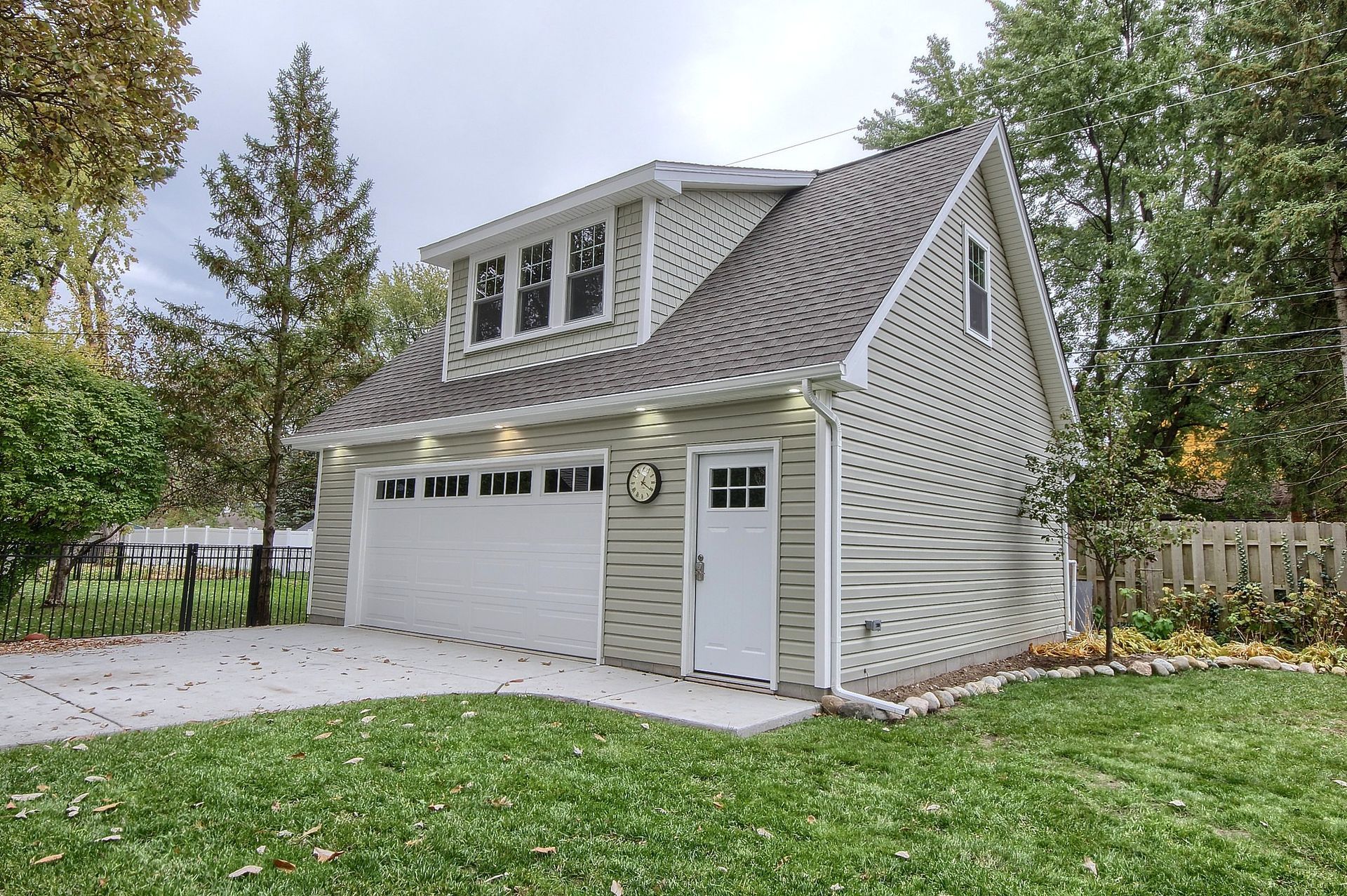 This is a 28’x 24′ custom garage with attic trusses and loft area. Building the shed dormer on the front of the garage really added significant space to the upstairs and a much larger feel to the living area. The homeowner wanted to create a livable space upstairs so insulation was added as well as a mini-split heating and cooling unit.