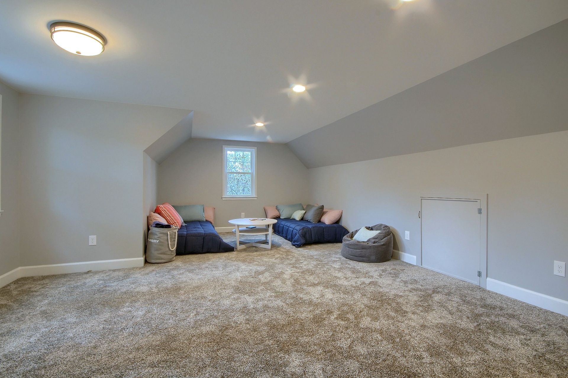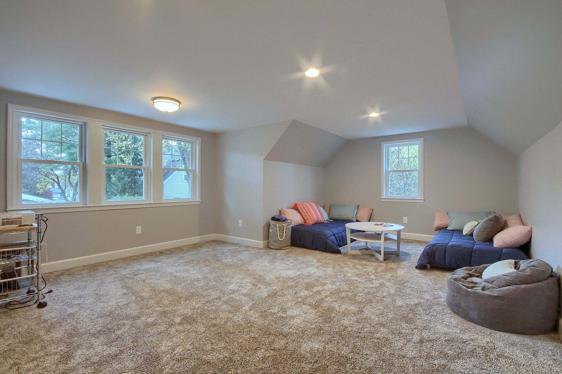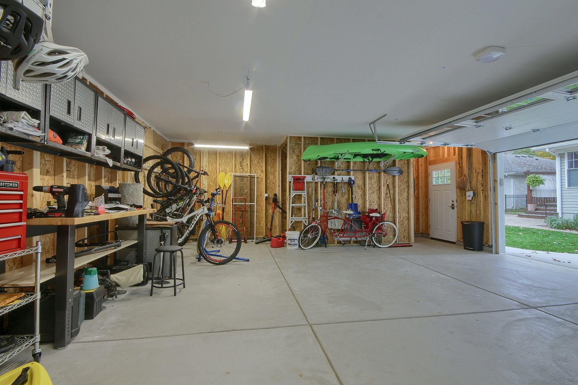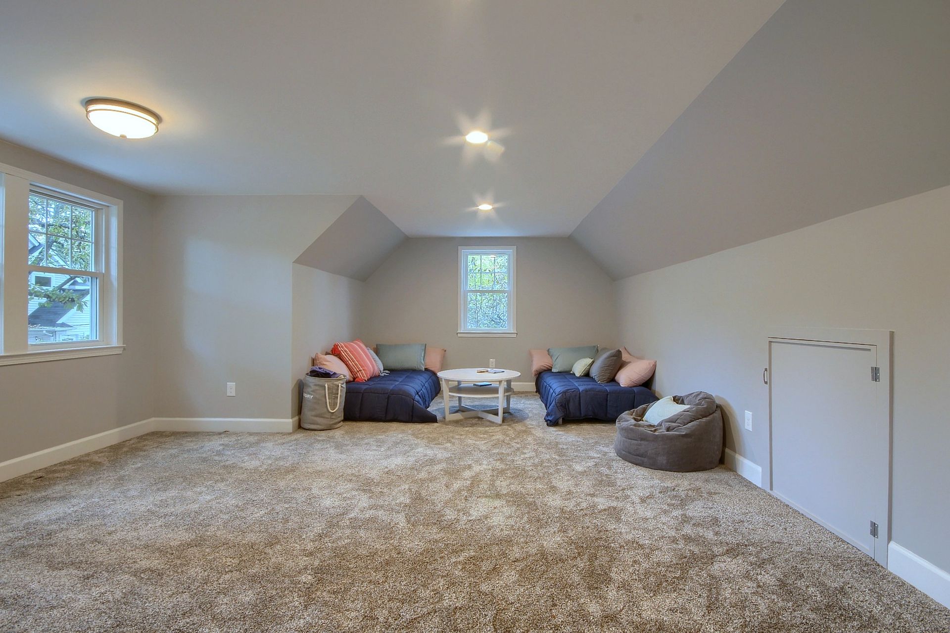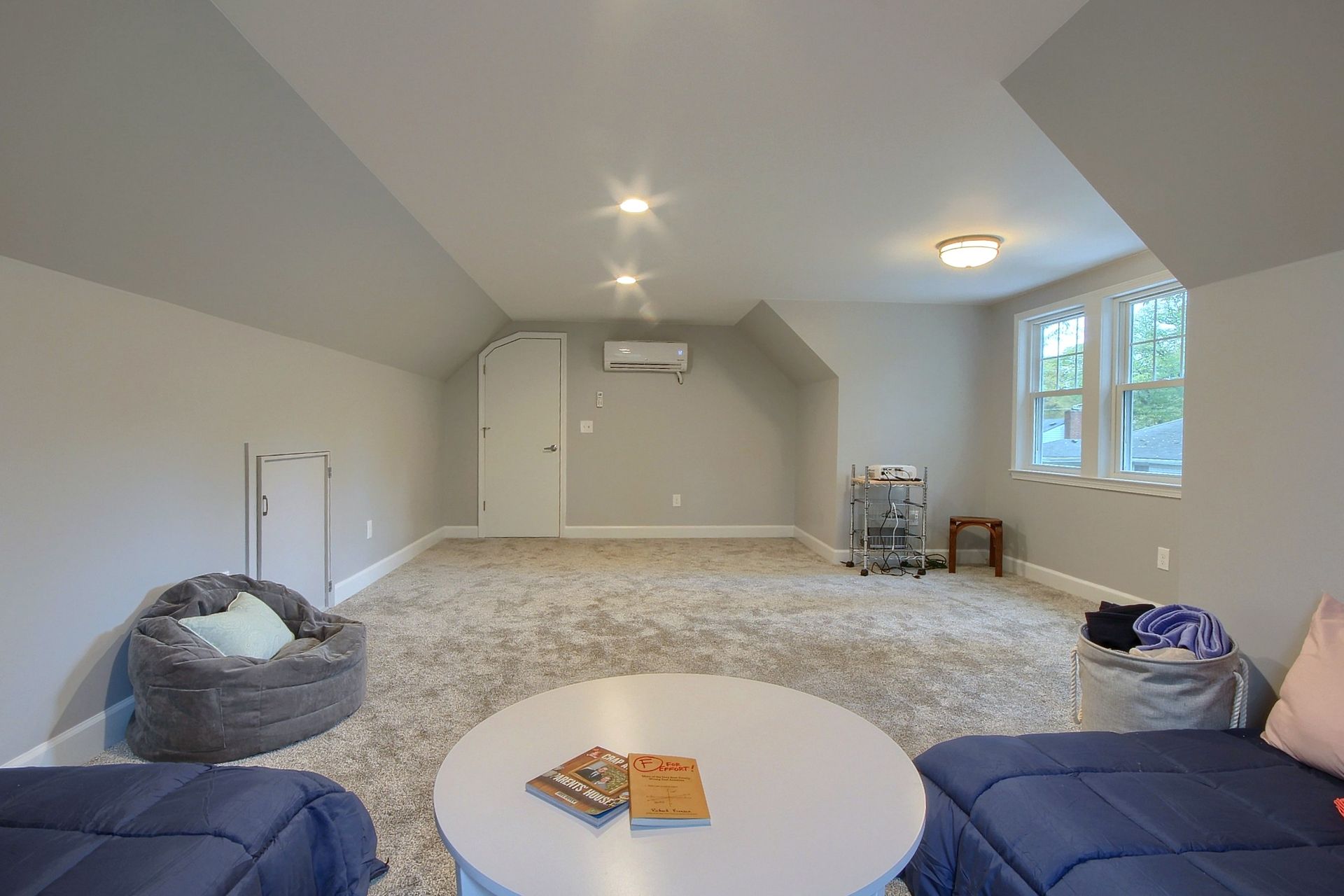 This is a 28’x 24′ custom garage with attic trusses and loft area. Building the shed dormer on the front of the garage really added significant space to the upstairs and a much larger feel to the living area. The homeowner wanted to create a livable space upstairs so insulation was added as well as a mini-split heating and cooling unit.