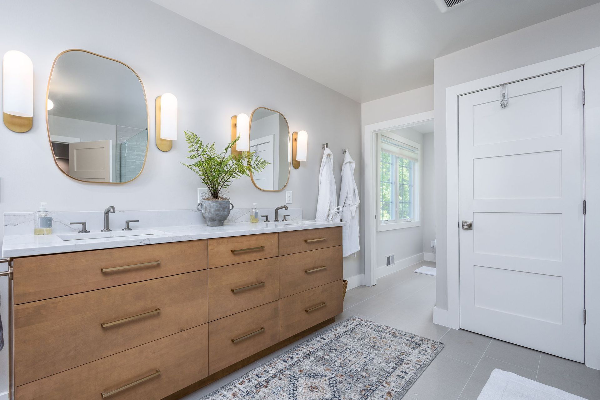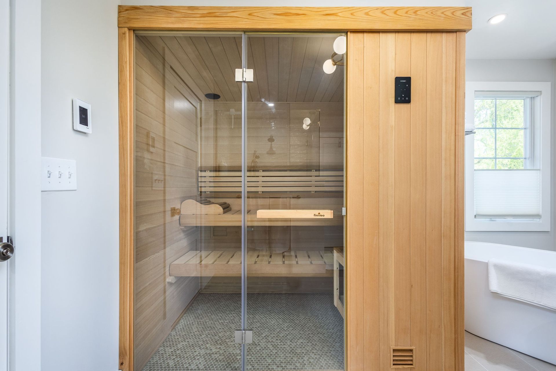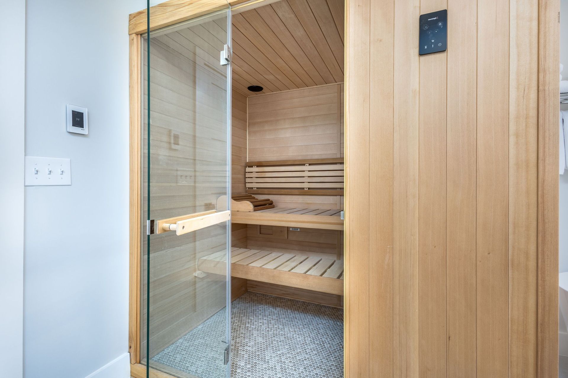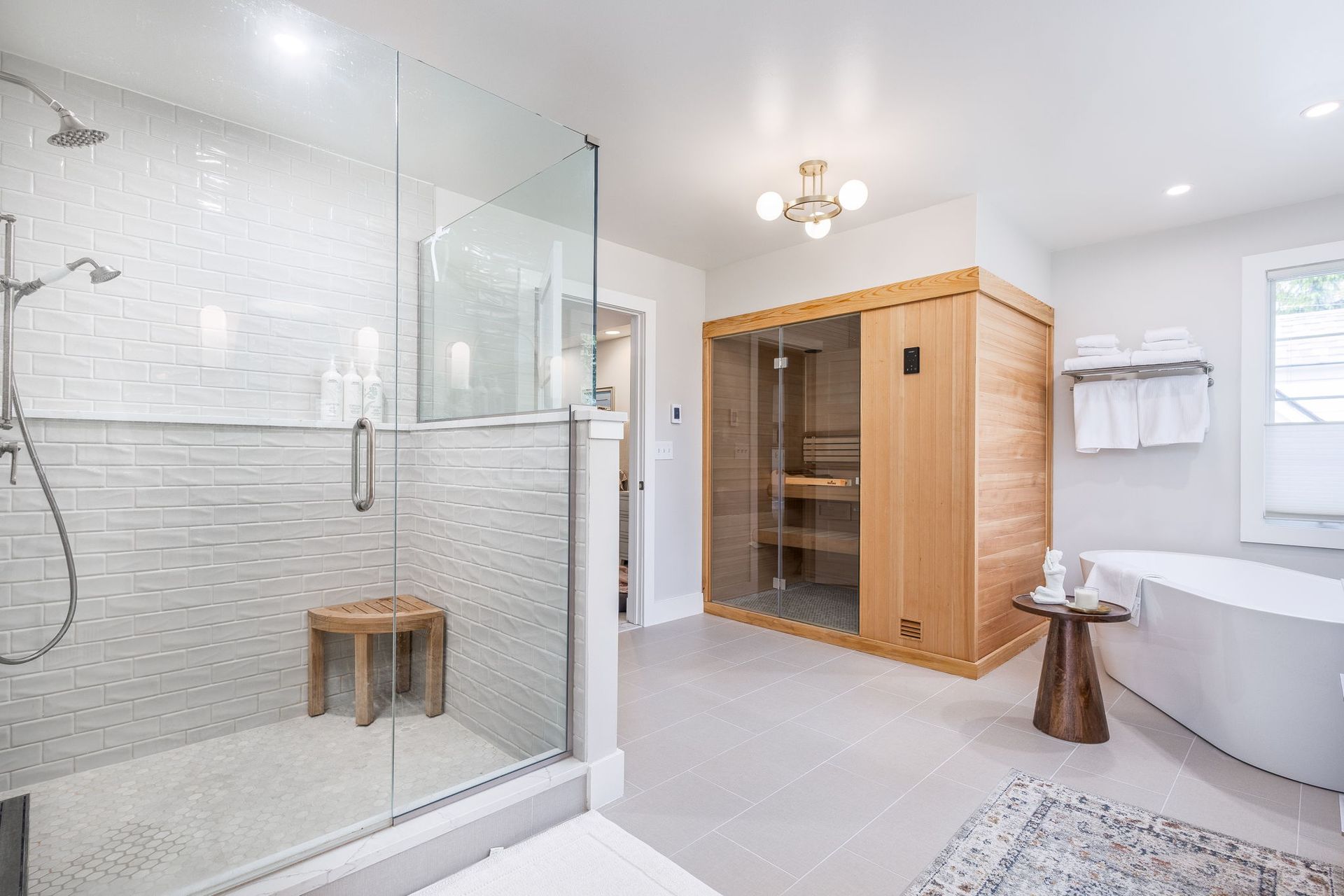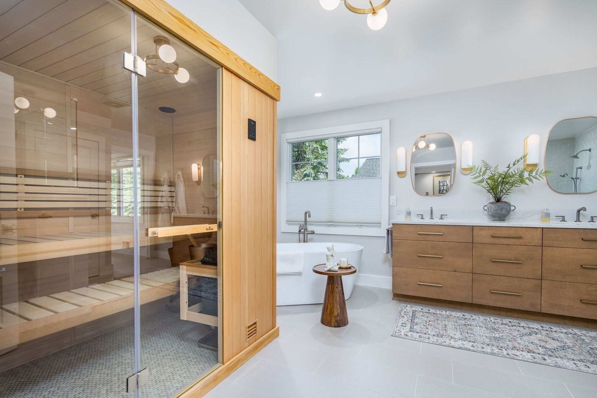 The existing master bath was original and the owners wanted a modified layout consisting of joining the two separate vanities, getting rid of the old drop in, triangular rub and adding a sauna.