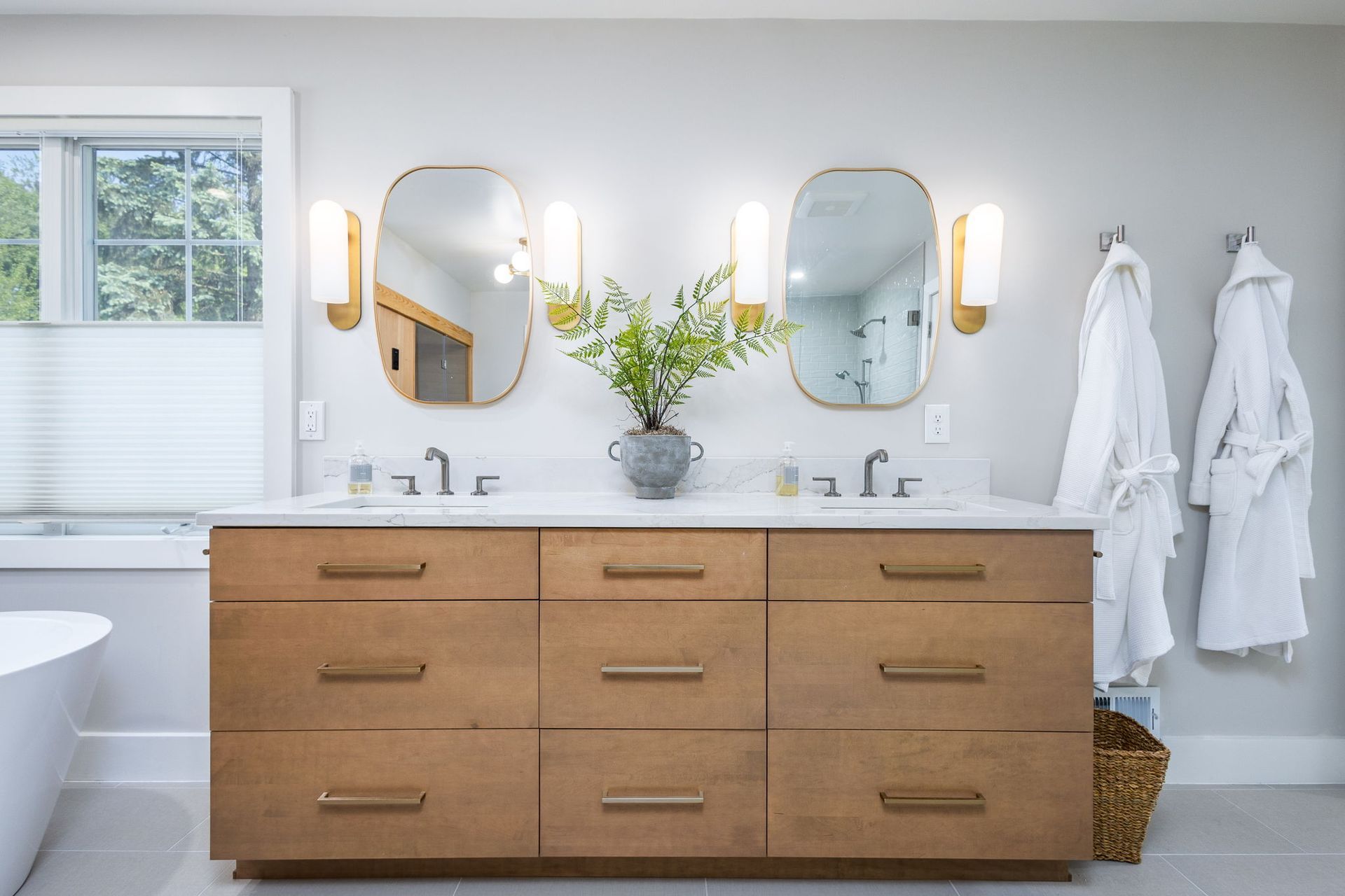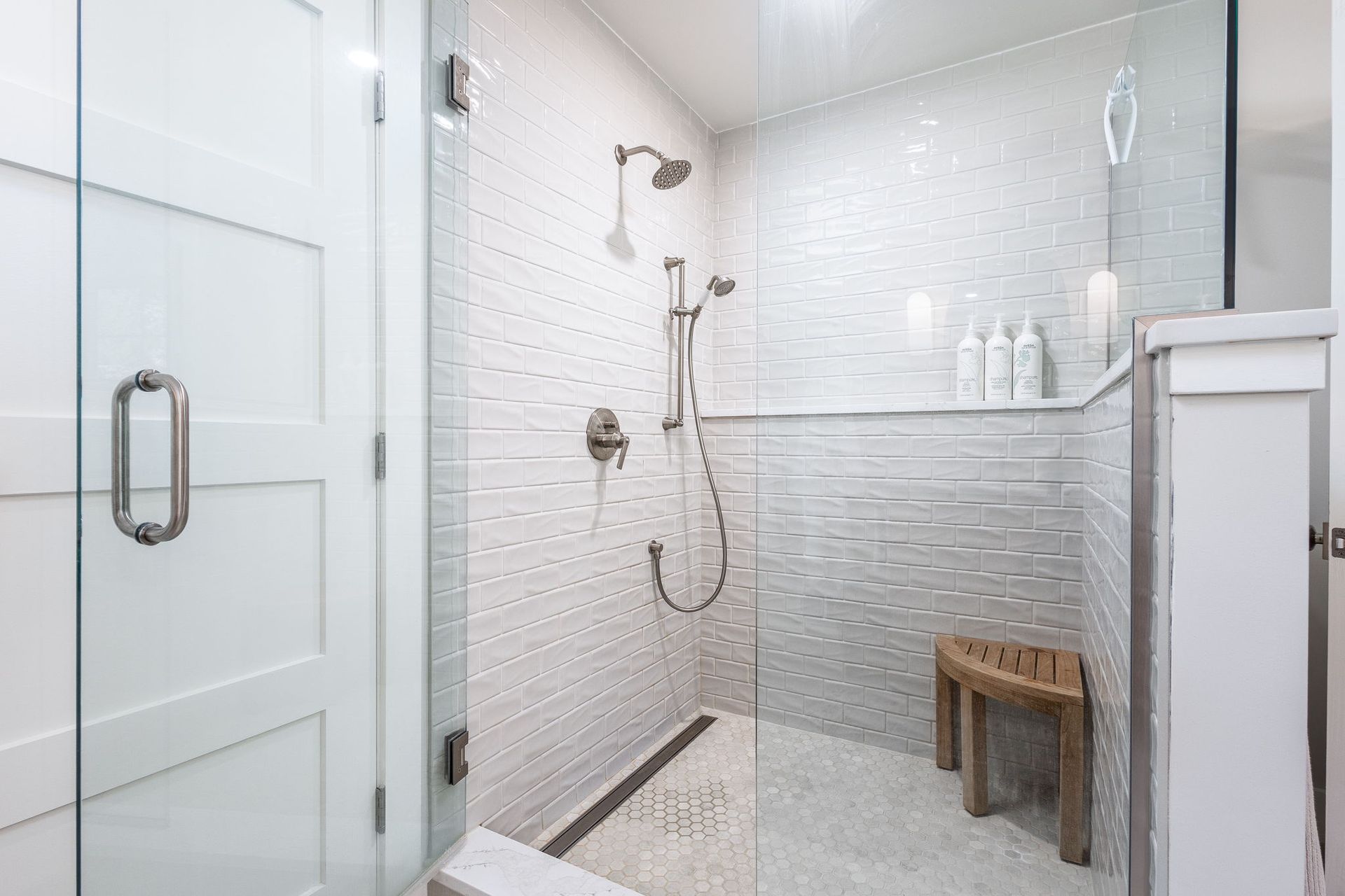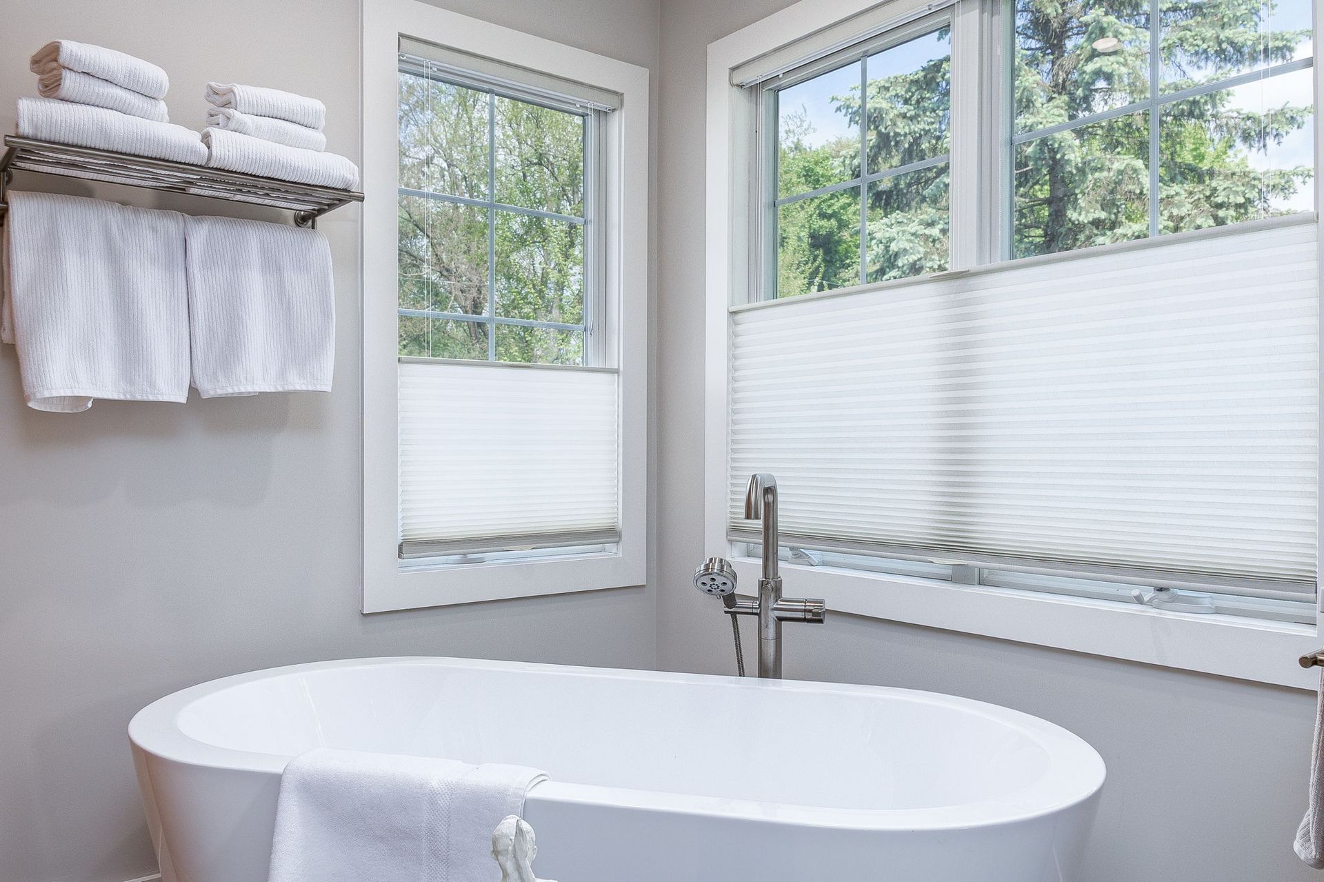 Heated floors were installed throughout this spacious bathroom along with an enlarged shower area. The design and finishes were by Haven & Company in Plymouth. New Andersen 400 Series windows were also installed in the bathroom.