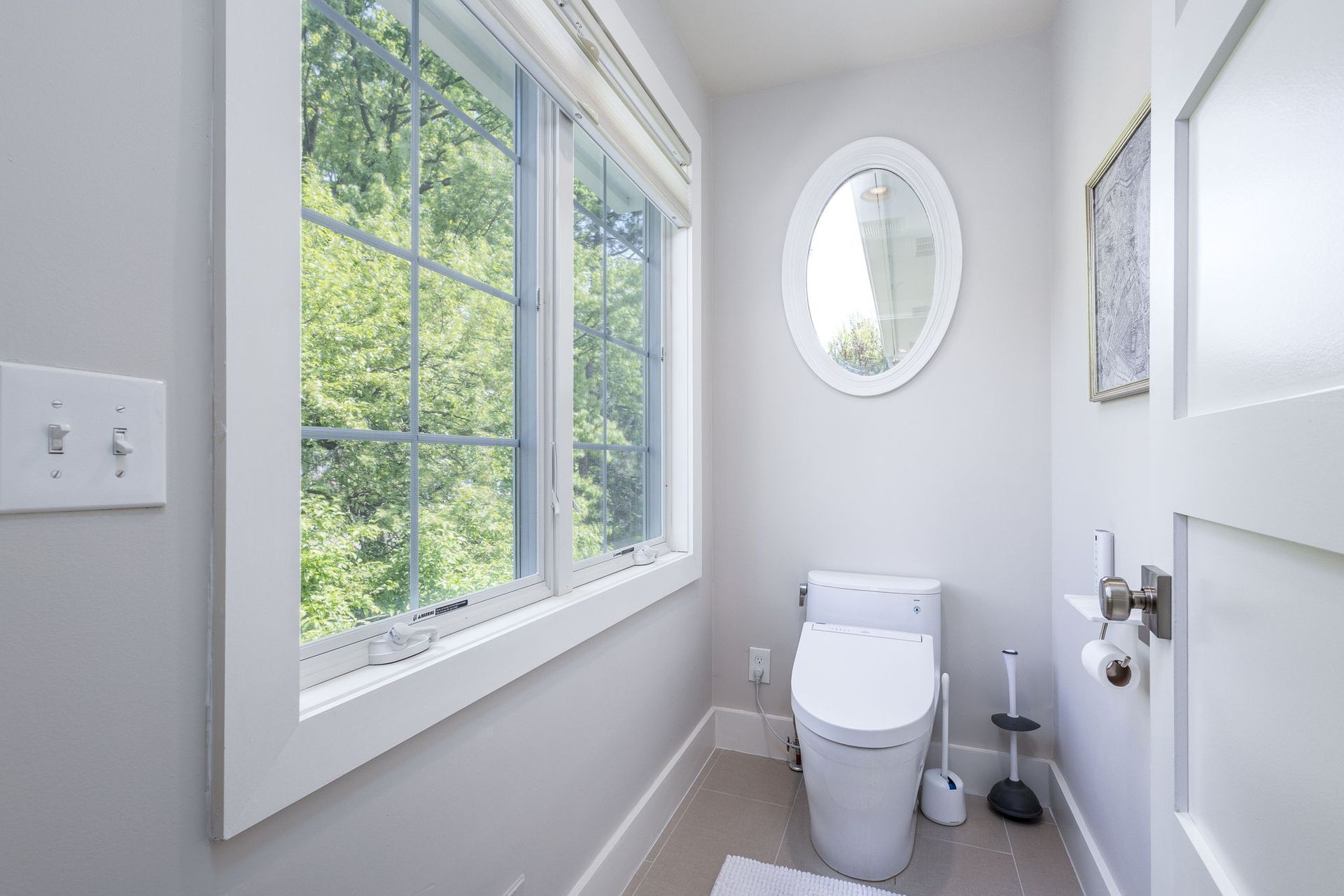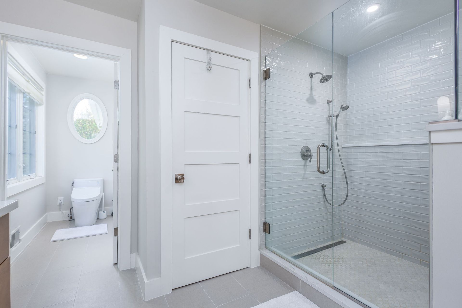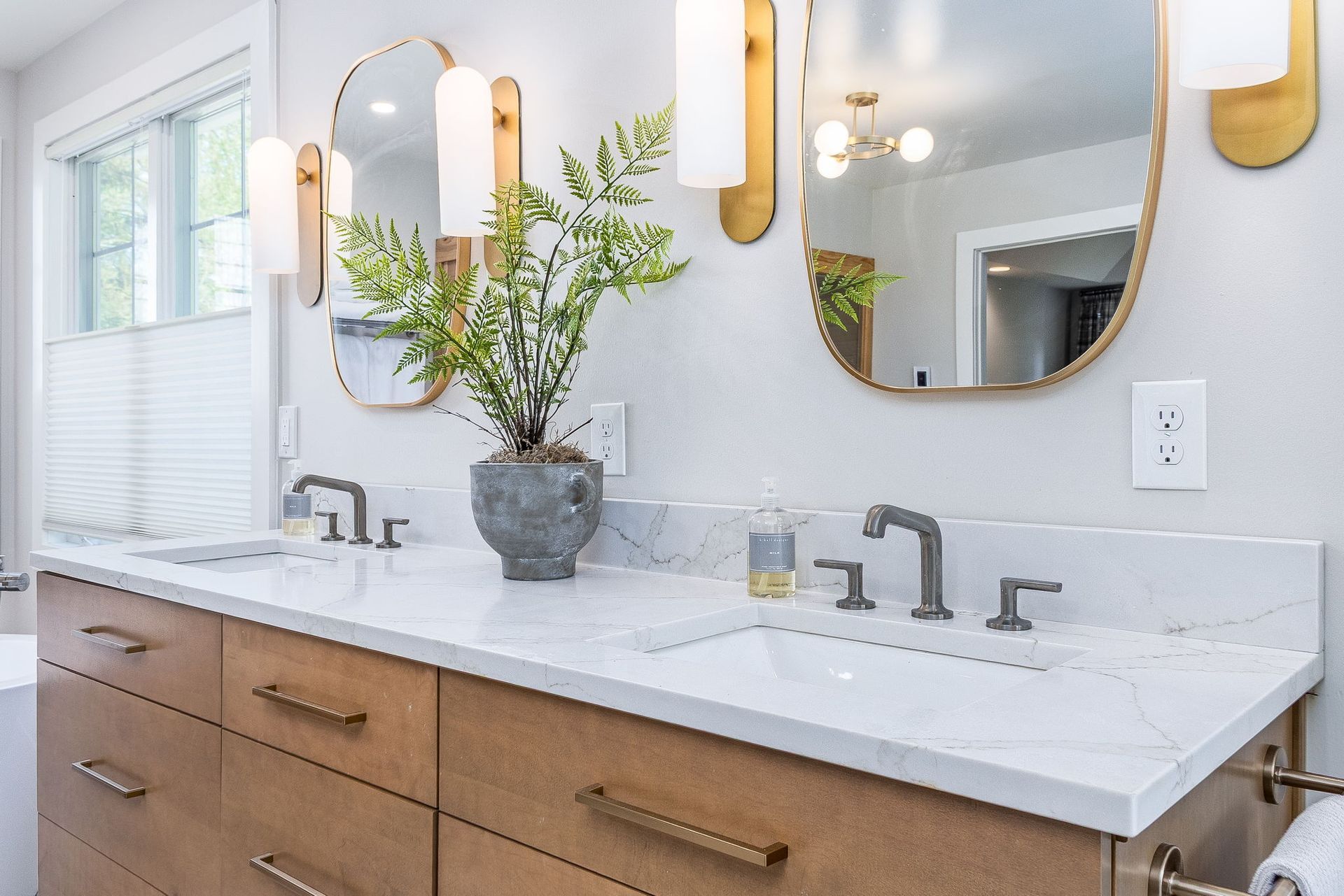 Heated floors were installed throughout this spacious bathroom along with an enlarged shower area. The design and finishes were by Haven & Company in Plymouth. New Andersen 400 Series windows were also installed in the bathroom.