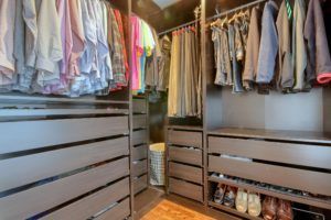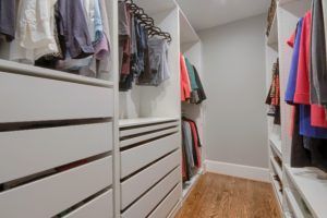 Hardwood flooring was installed throughout the addition to match the existing floors. The bedroom features a shiplap wall and his and hers walk-in closets with custom shelving.