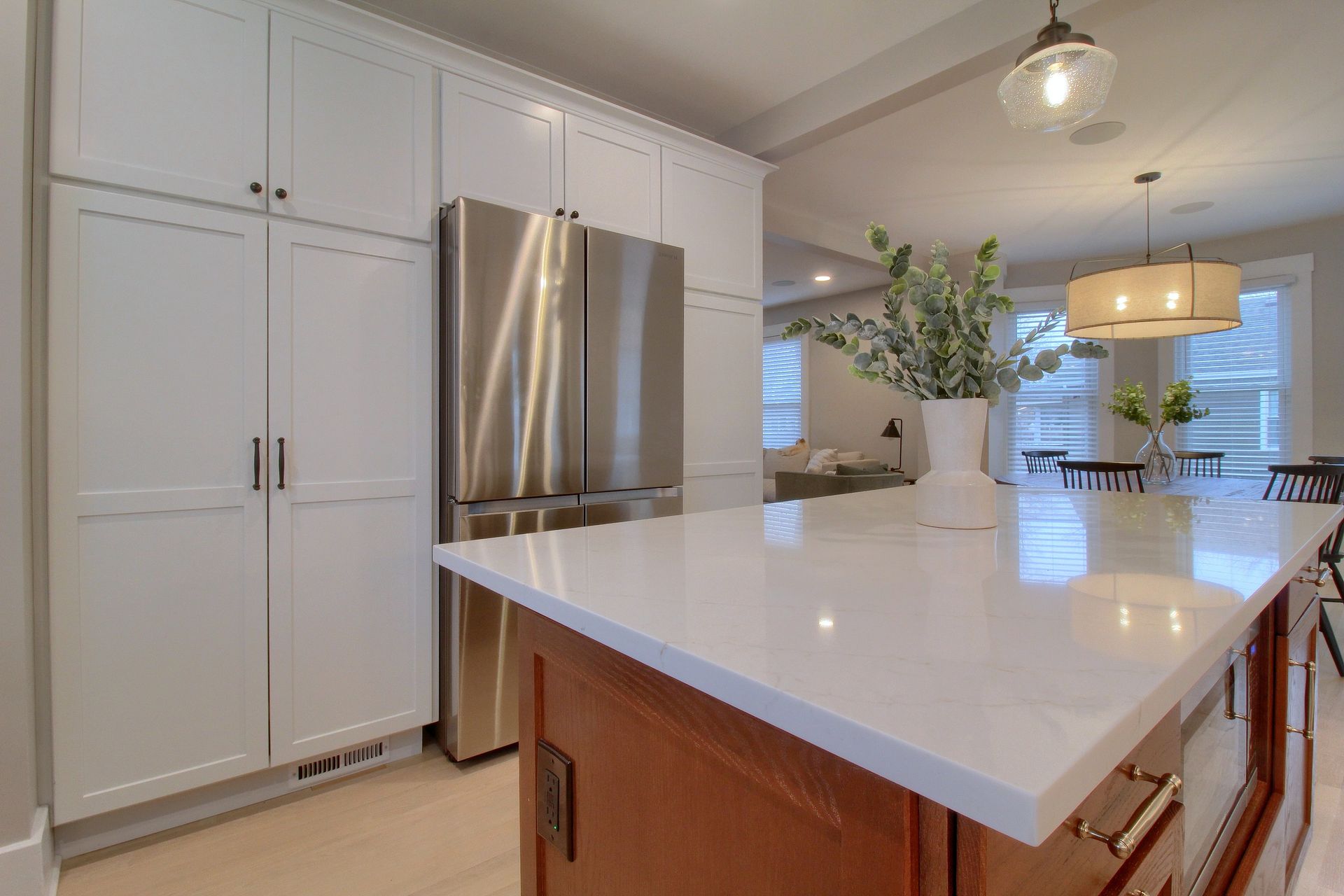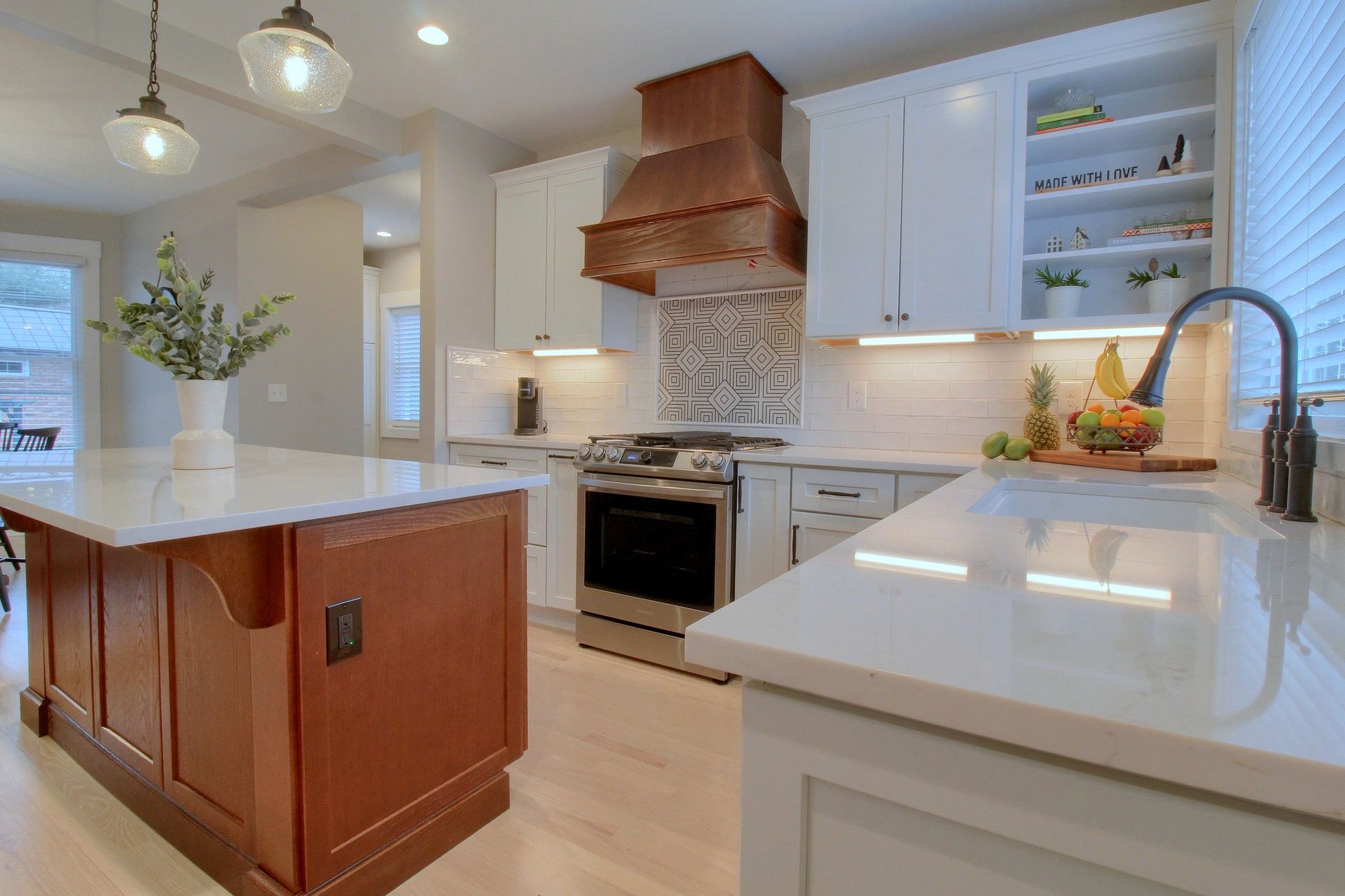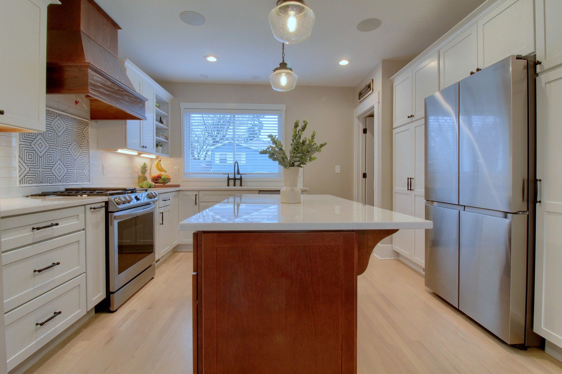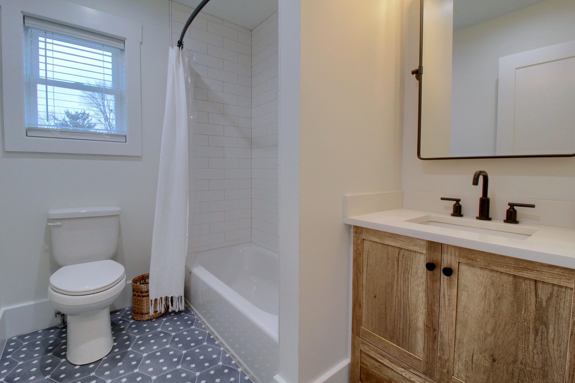 This project consisted of taking the entire roof off the house and rebuilding the second floor to include three bedrooms and two bathrooms. The design was simple as the owner wanted to keep the original style in mind and blend in with the existing neighborhood. A second furnace and A/C were added to ensure a properly heated and cooled space. The original porch was taken down as well and a new covered porch added with a tongue and groove cedar ceiling and Trex porch and railings. The rear of the first floor was also bumped out to make room for a new mudroom, full bath and enlarged kitchen. New hardwoods were blended into the existing and stained with a whitewash.